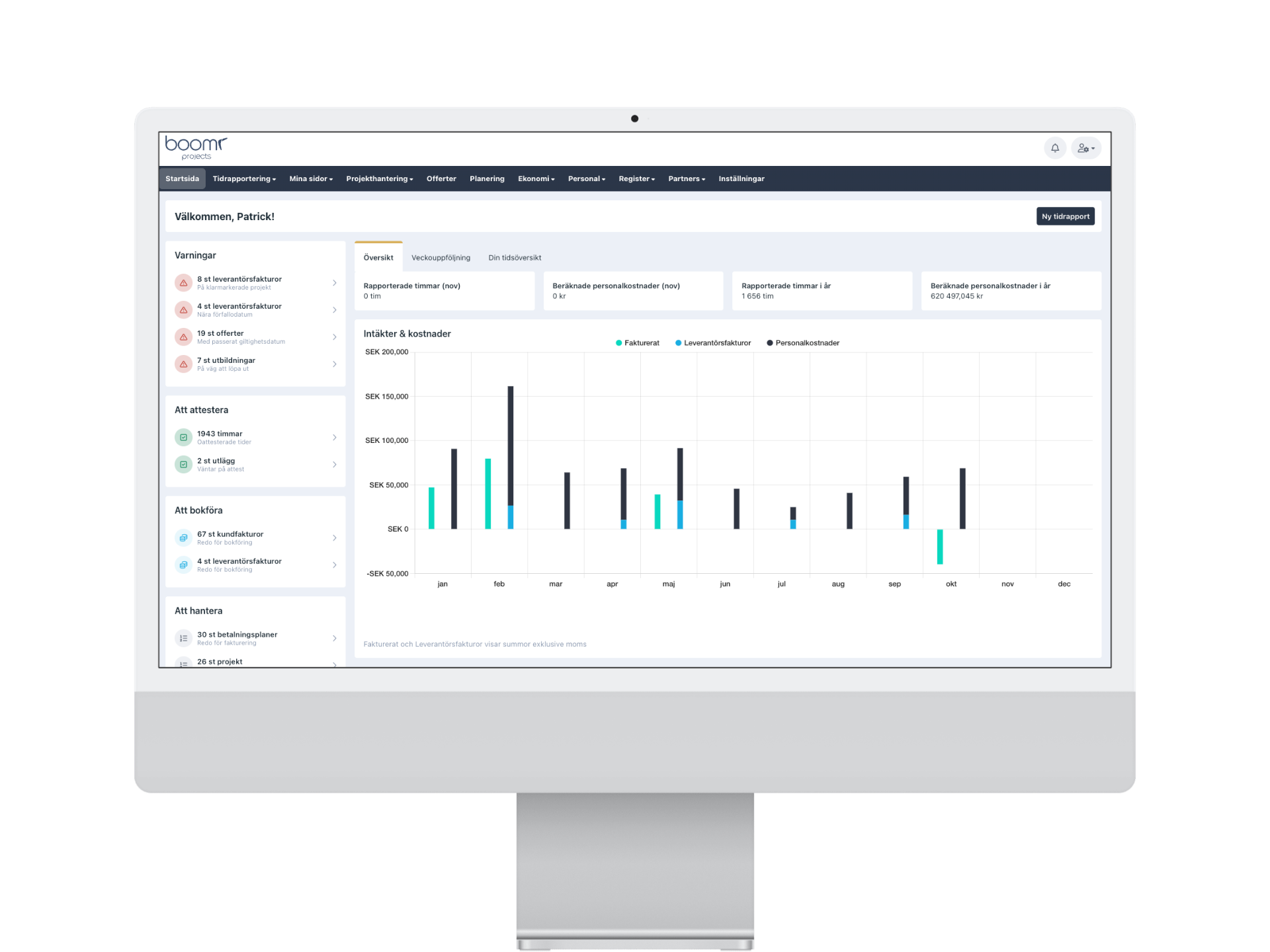 Få en tydlig översikt över alla pågående projekt, kostnader och timmar i realtid. Boomr gör det enkelt att följa upp lönsamhet, planera resurser och se exakt var tiden går – allt samlat på ett ställe.