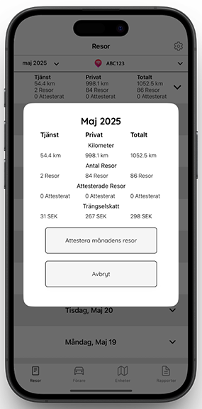 Systemet registrerar automatiskt dina körningar, skiljer mellan privata och tjänsteresor, och gör det enkelt att exportera färdiga körjournaler – direkt i appen eller via webben.